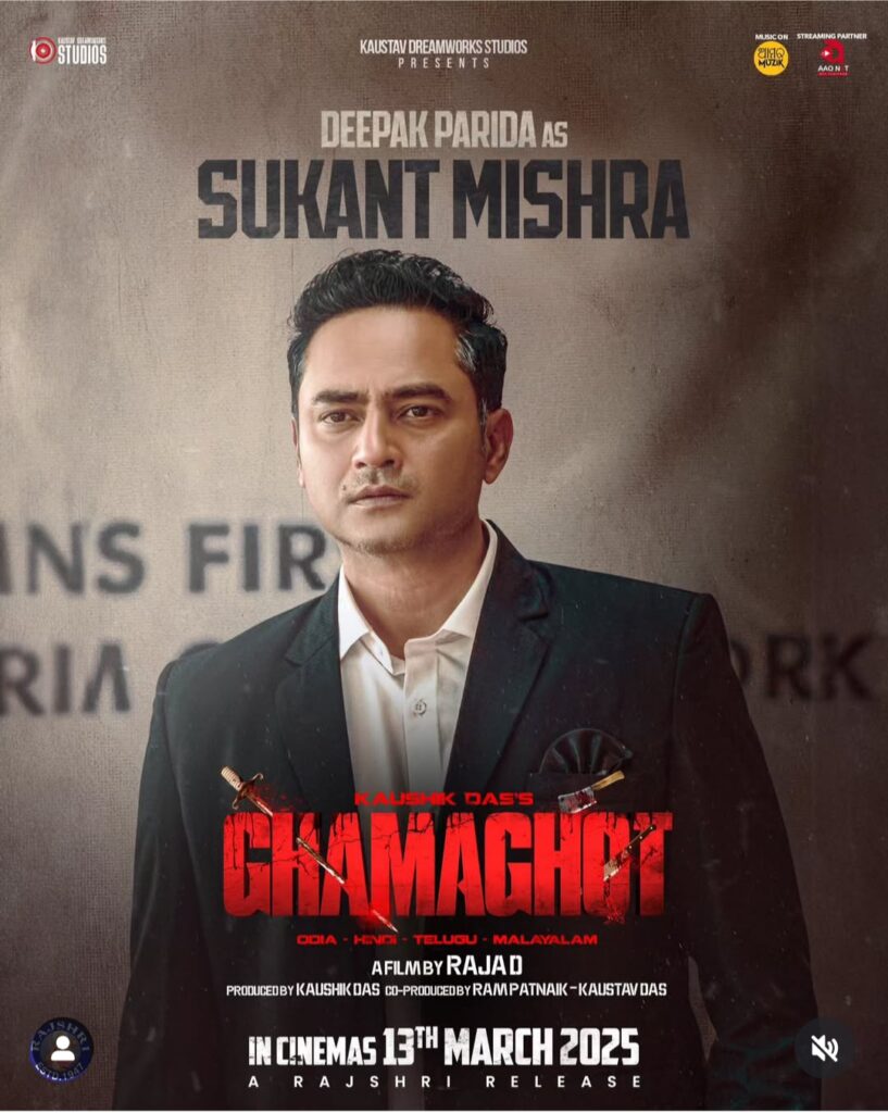 Releasing the appearance, the makers said “Some battles are fought with fate. Introducing Deepak Parida as ‘Sukant Mishra’ in the gripping action thriller ‘Ghamaghot’ – Releasing in cinemas on 13th March 2025.”