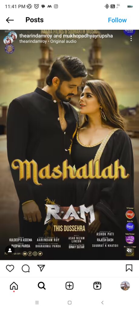 Bhubaneswar : The new romantic song from the Aarindam’s upcoming movie RAM titled ‘ Mashallah’ will be releasing on October 10. The song stars Aarindam Roy and Rupsha Mukhopadhyay.